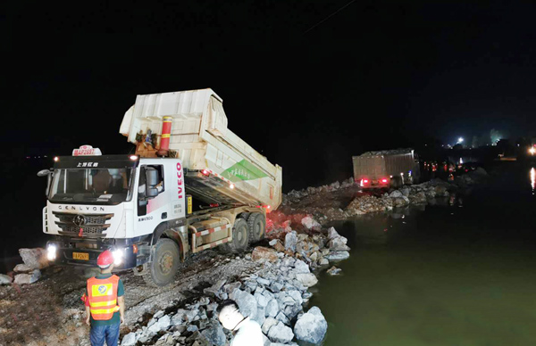 7月13日下午,公司完成封堵工作技術(shù)測量和封堵工作技術(shù)方案制定,7月13日晚上,搶險技術(shù)、施工人員及設(shè)備陸續(xù)進場,并調(diào)配塊石、砂礫石等各類材料進場。決口封堵采取南北兩岸同時進占方式施工, 7月14日中午14時開始進占施工,經(jīng)過兩天兩夜連續(xù)55個小時施工作業(yè),于7月16日晚上21時43分,完成決口合攏,比預(yù)計完工時間提前50小時。